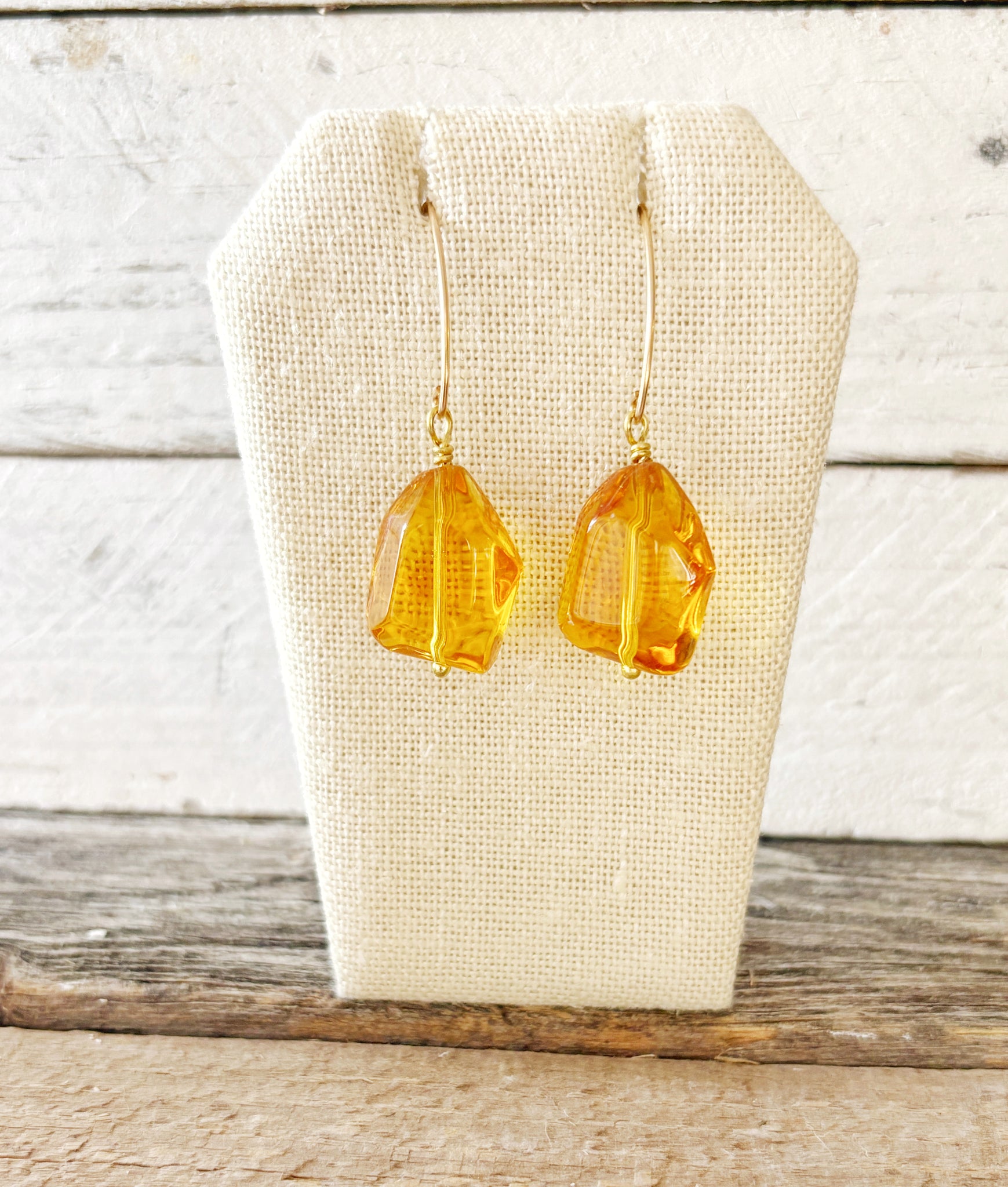 These are amber colored glass nuggets. I wire wrapped them onto fancy gold plated earwires. They hang just under 2" long.