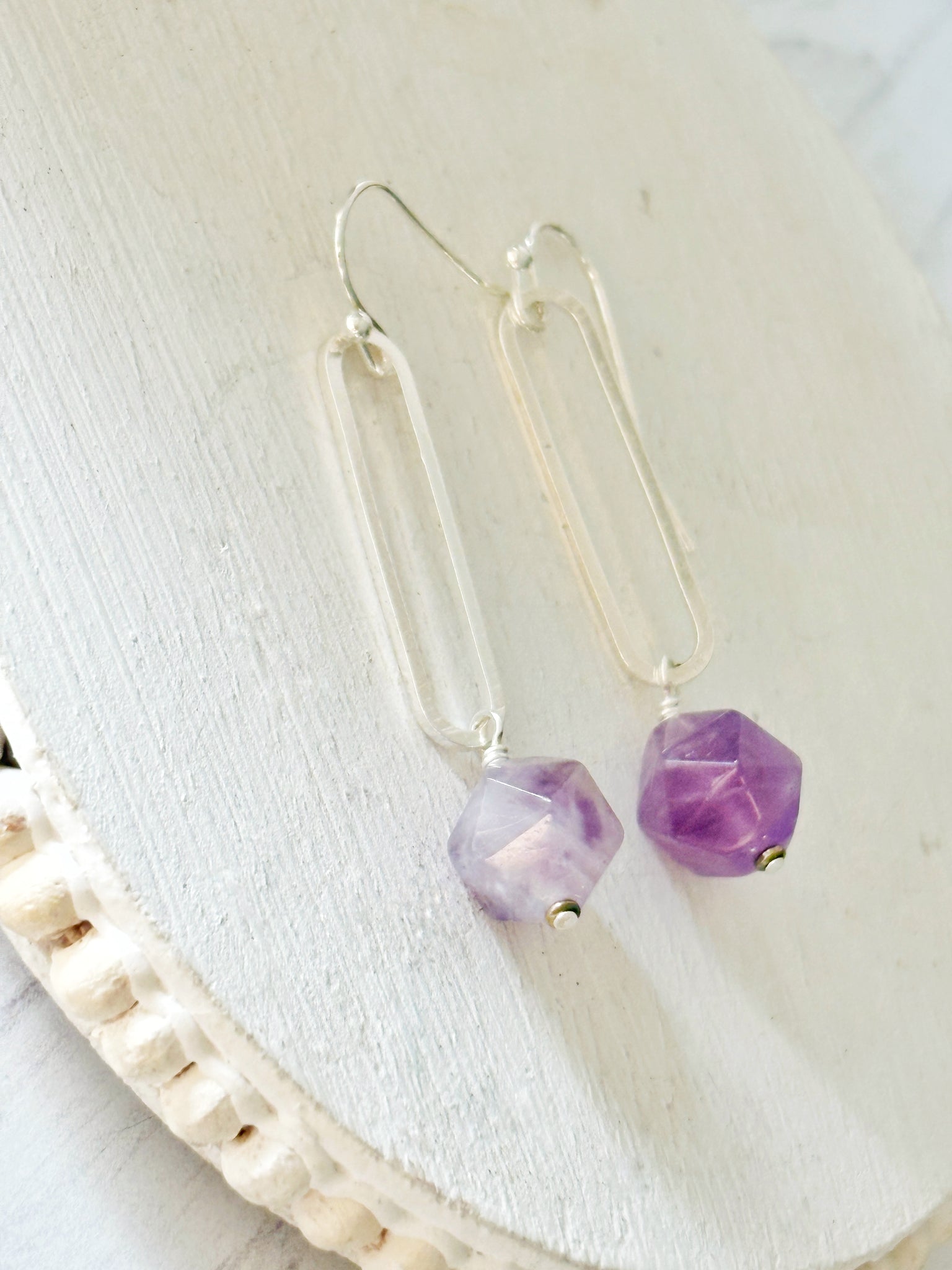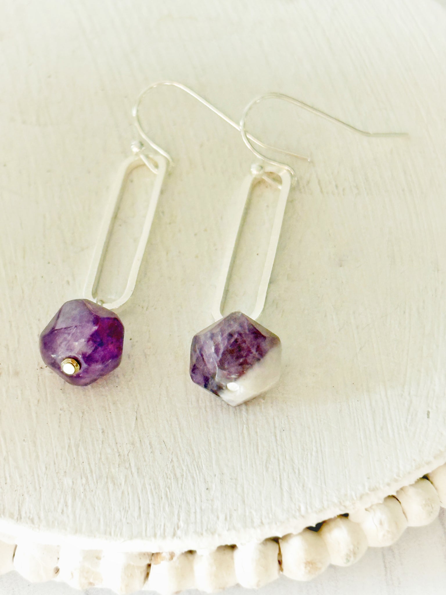 I wire wrapped faceted amethysts onto long silver colored oval pieces and then attached to silver plated earwires.