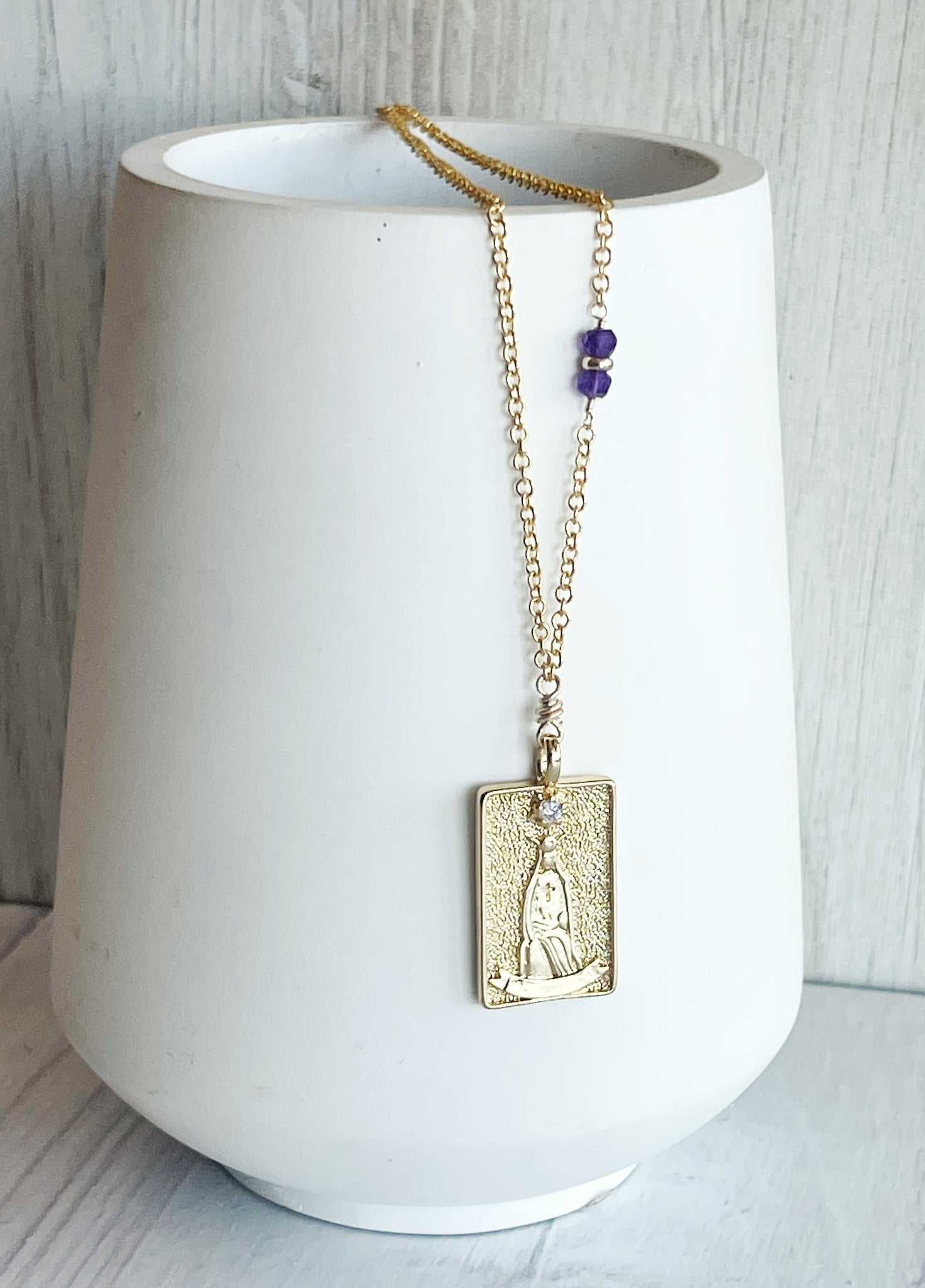 I attached a gold plated High Priestess Tarot Card pendant onto 18" of gold plated chain. I then wire wrapped tiny amethyst gemstones into the chain.