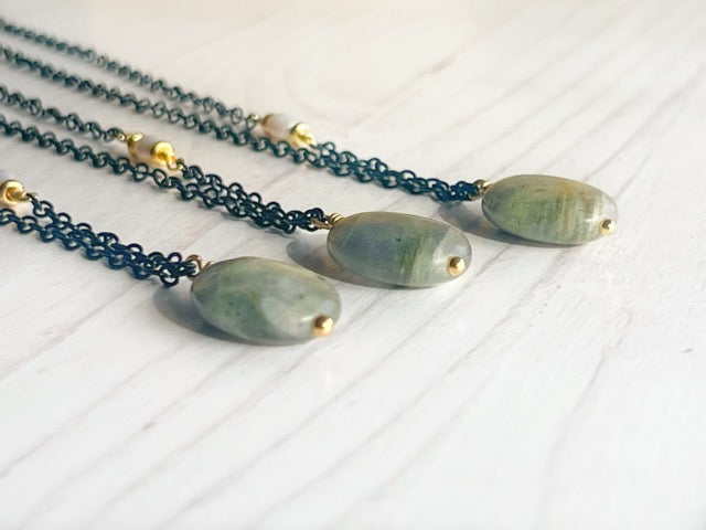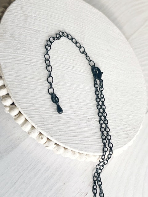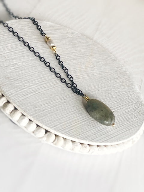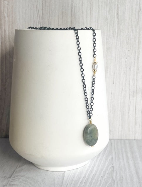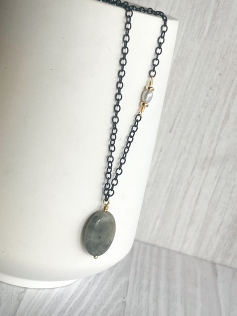 Made with a labradorite stone on a black coated chain with a pearl accent hand wrapped into the chain. The chain is 18 inches and comes with an extender so you can wear it exactly how you want.