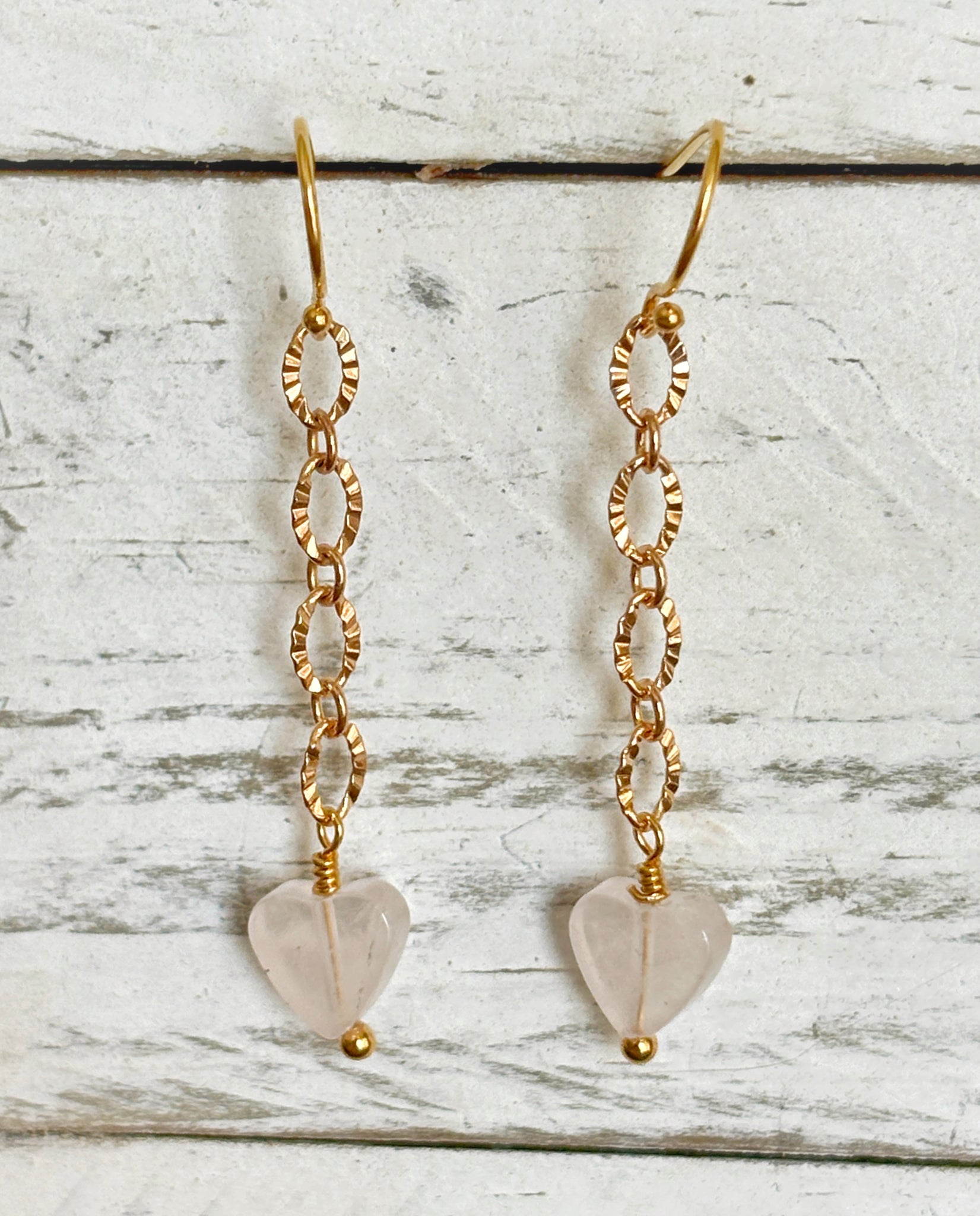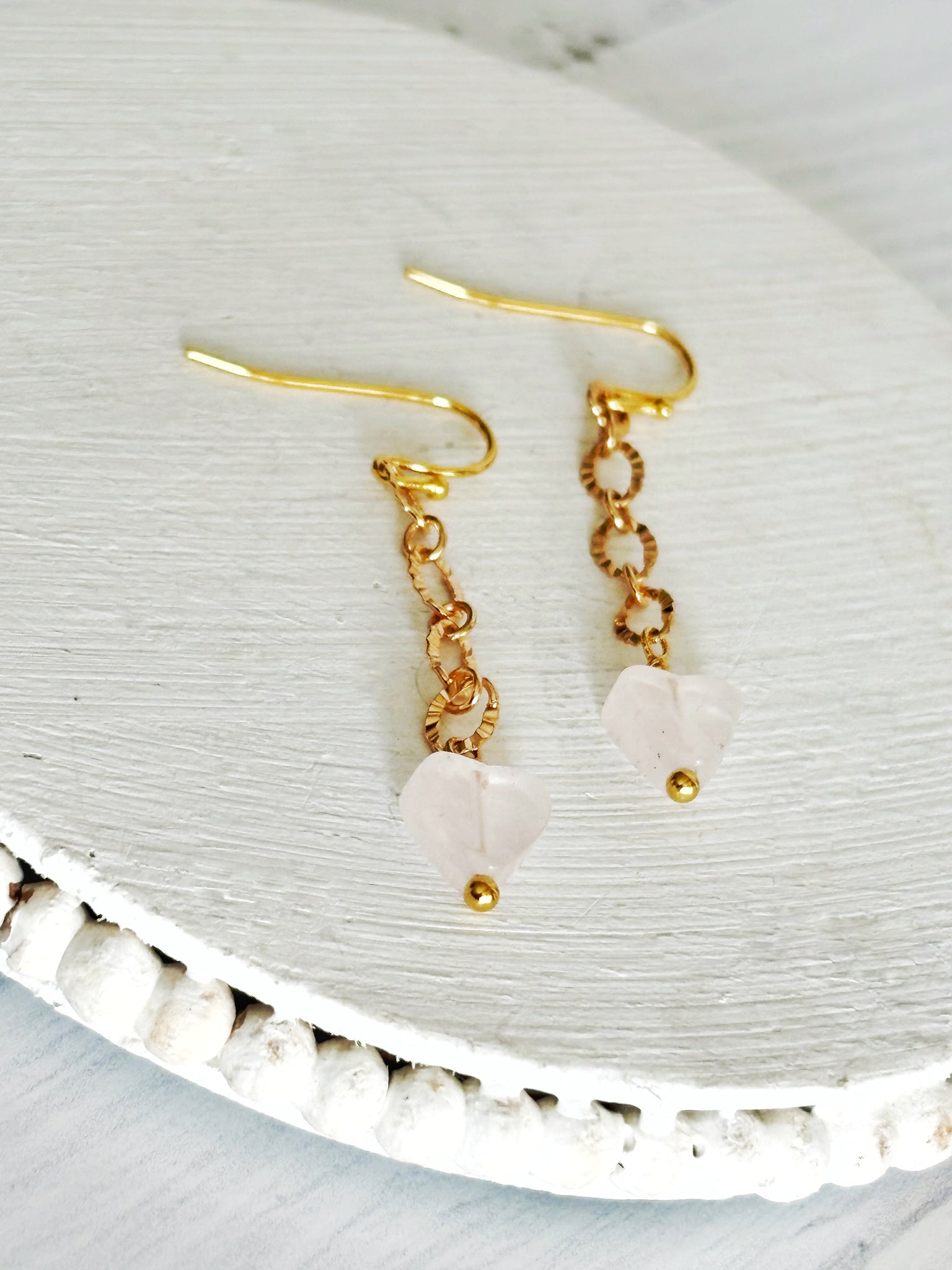 Soft stone, sharp truth. These earrings feature rose quartz heart drops on gold-plated chain and earwires, and they hang approximately 2" long. A sweet little reminder that butterflies can be anxiety, and real chemistry feels calm, not chaotic.