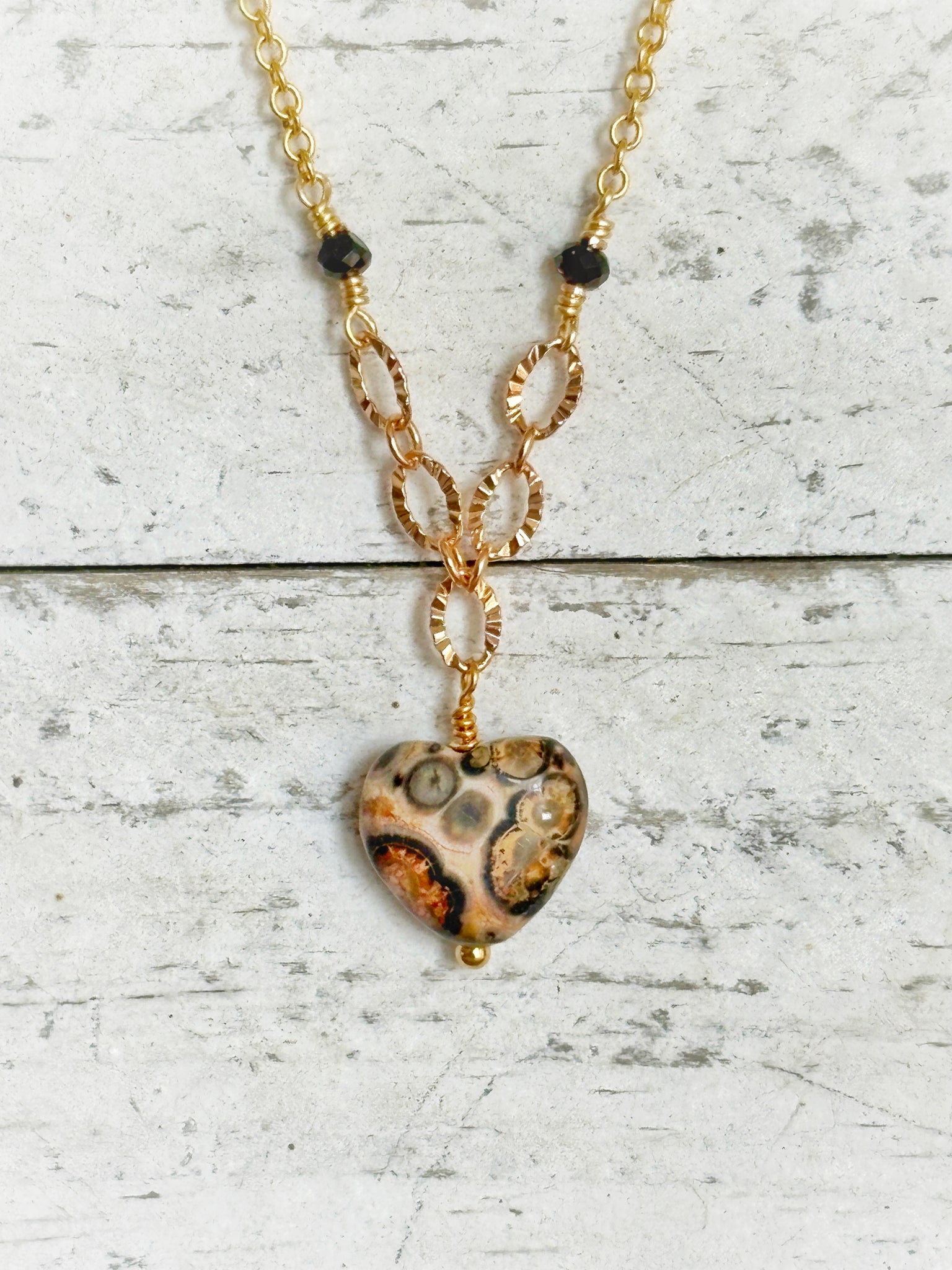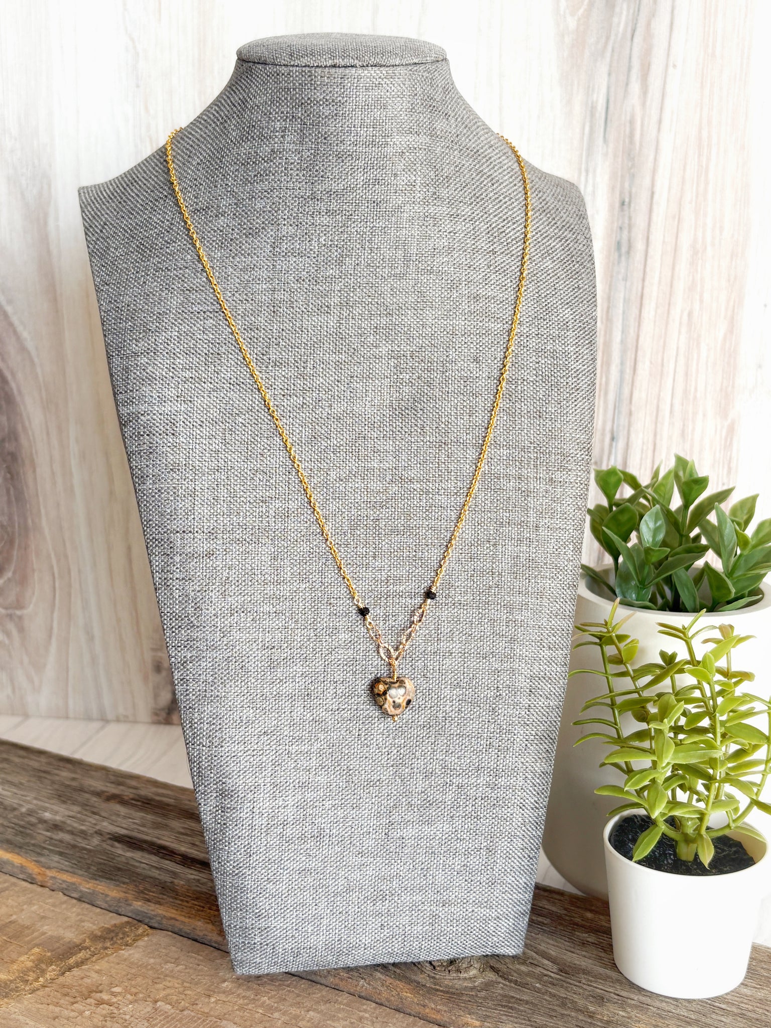 A sweet statement with sharp boundaries. This necklace features a leopard skin jasper heart on two types of gold-plated chain, finished with small black crystal accent beads for a subtle edge. 20" length. Wear it as a reminder that real love feels safe, steady, and kind, not painful.