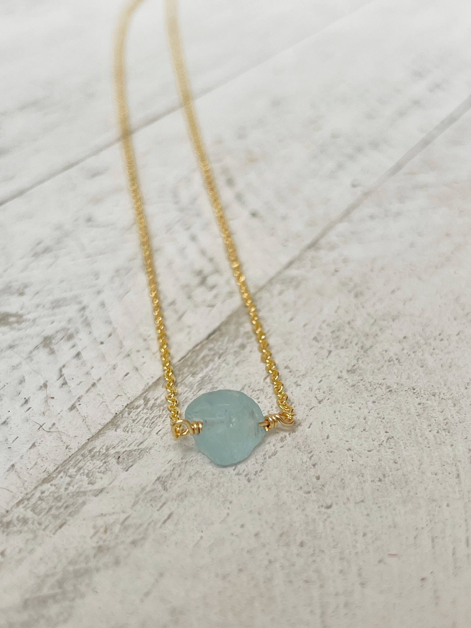 I wire wrapped a natural, rough aquamarine onto chain. Each stone is unique in color and size, so each necklace will vary slightly from the picture.
